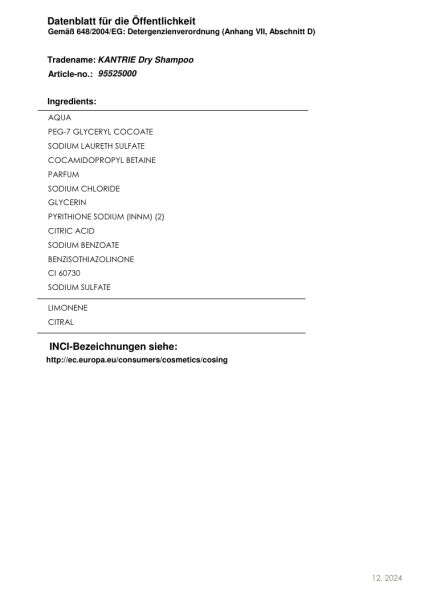 < 5 % anionische Tenside, < 5 % nichtionische Tenside, < 5 % amphotere Tenside, Duftstoffe (Limonene, Citral), Konservierungsmittel (Pyrithione Sodium (INNM), Sodium benzonate, Benzisothizolinone)