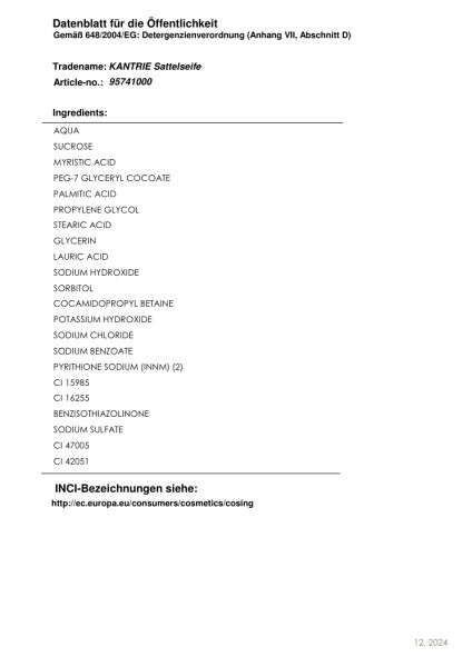 Mit der KANTRIE Sattelseife hältst du ein Produkt in der Hand, das sich sowohl durch seine einfache Anwendung als auch durch seine effektive Reinigungswirkung auszeichnet. Diese Sattelseife ist speziell darauf ausgelegt, Lederprodukte wie Sättel oder Zaumzeug gründlich zu reinigen und zu pflegen. Indem du sie regelmäßig anwendest, unterstützt du die Geschmeidigkeit und Langlebigkeit deiner Lederwaren, was gerade im Reitsport essenziell ist.